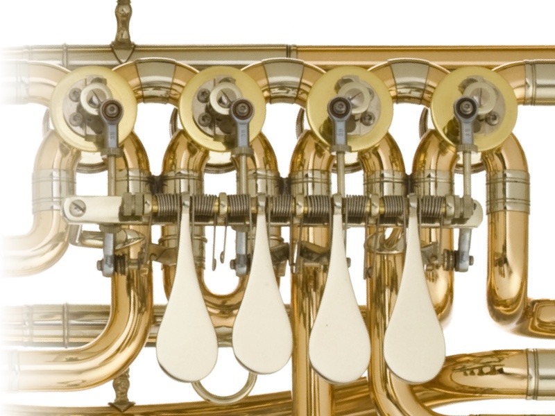 The “Meisterwerk” baritones feature a long oval shaped one piece branch, rotary valves with soft bends in valve exits as well as a spring guided 3B linkage system with 2 steel balls in durable bronze bearings.